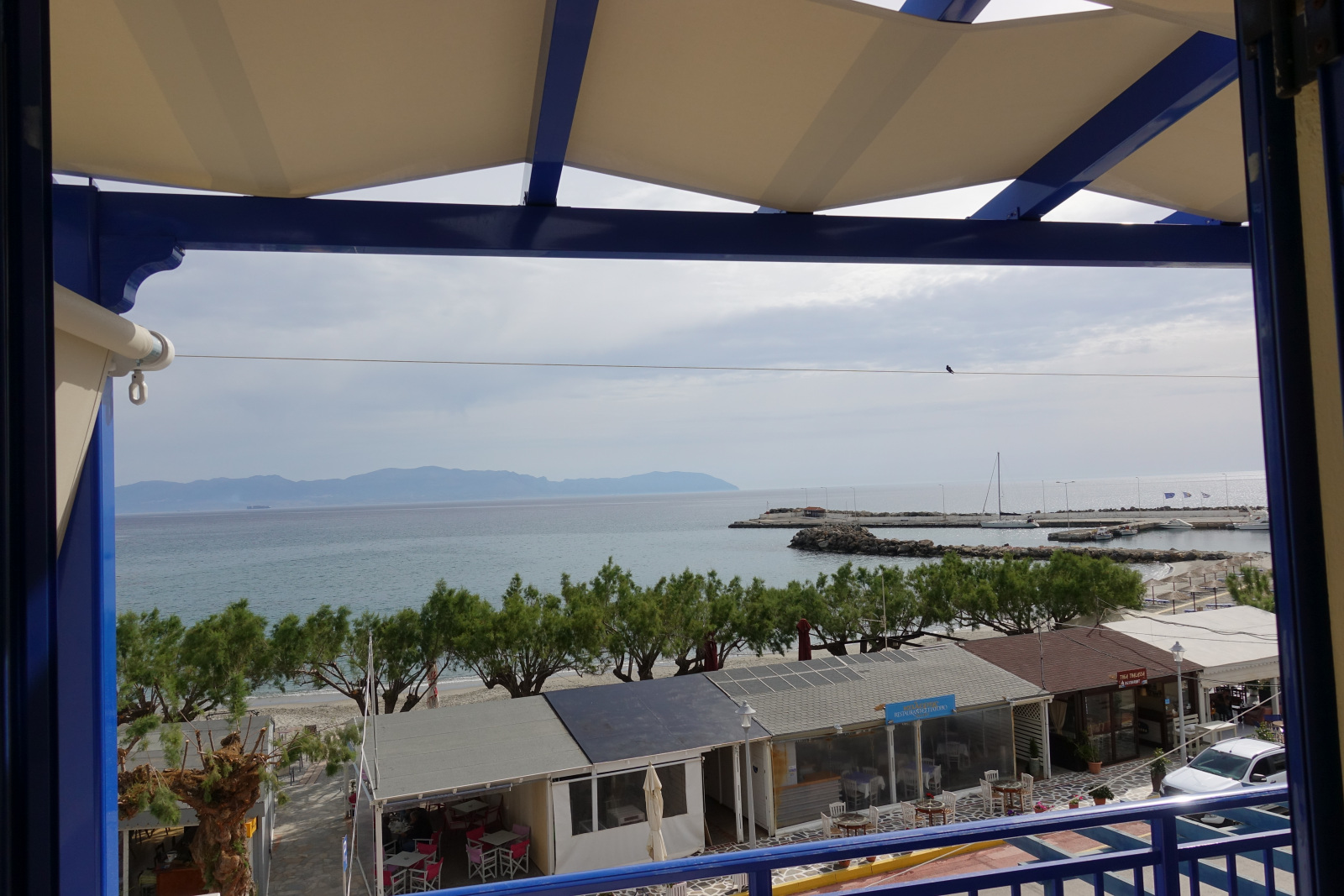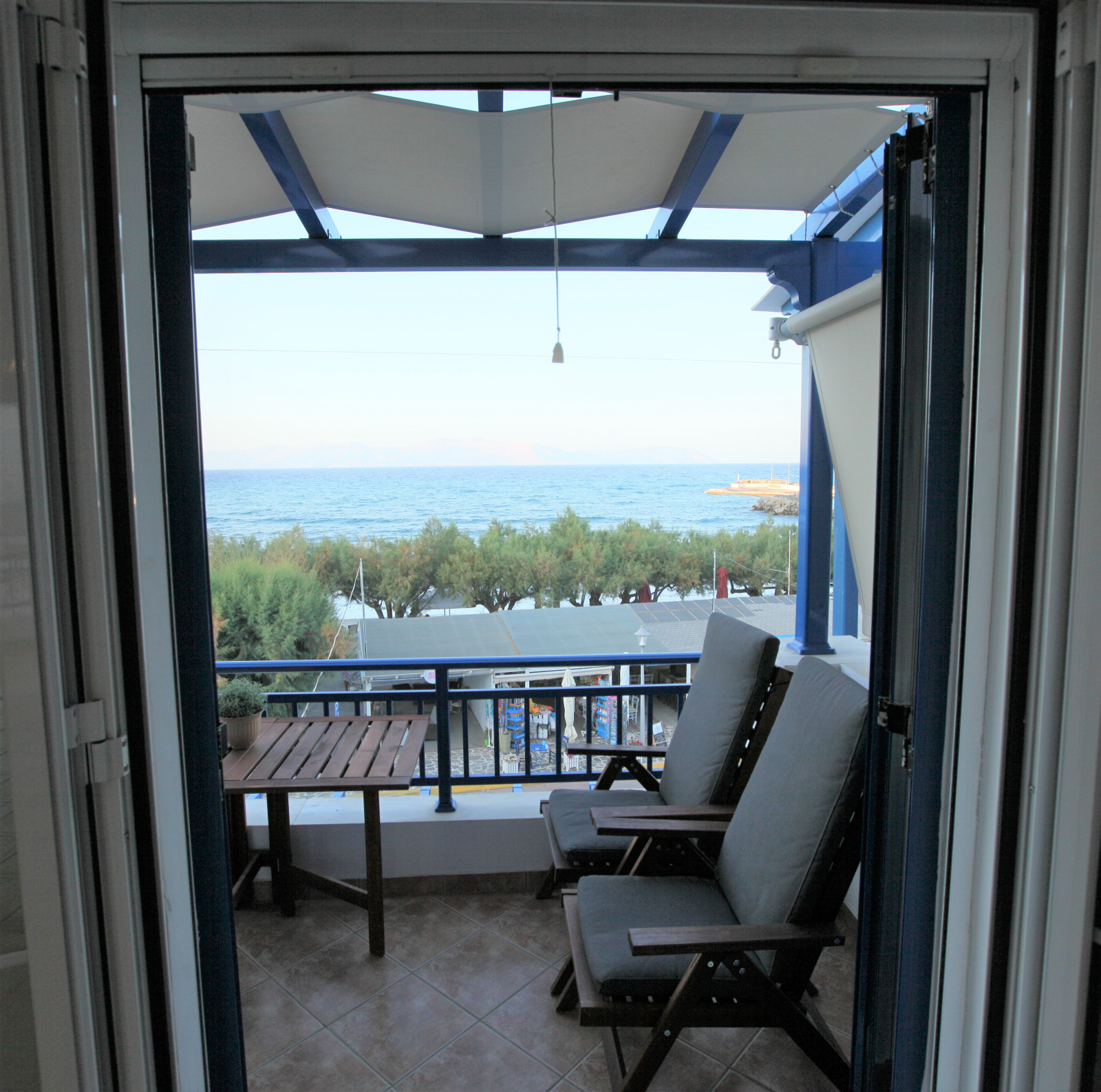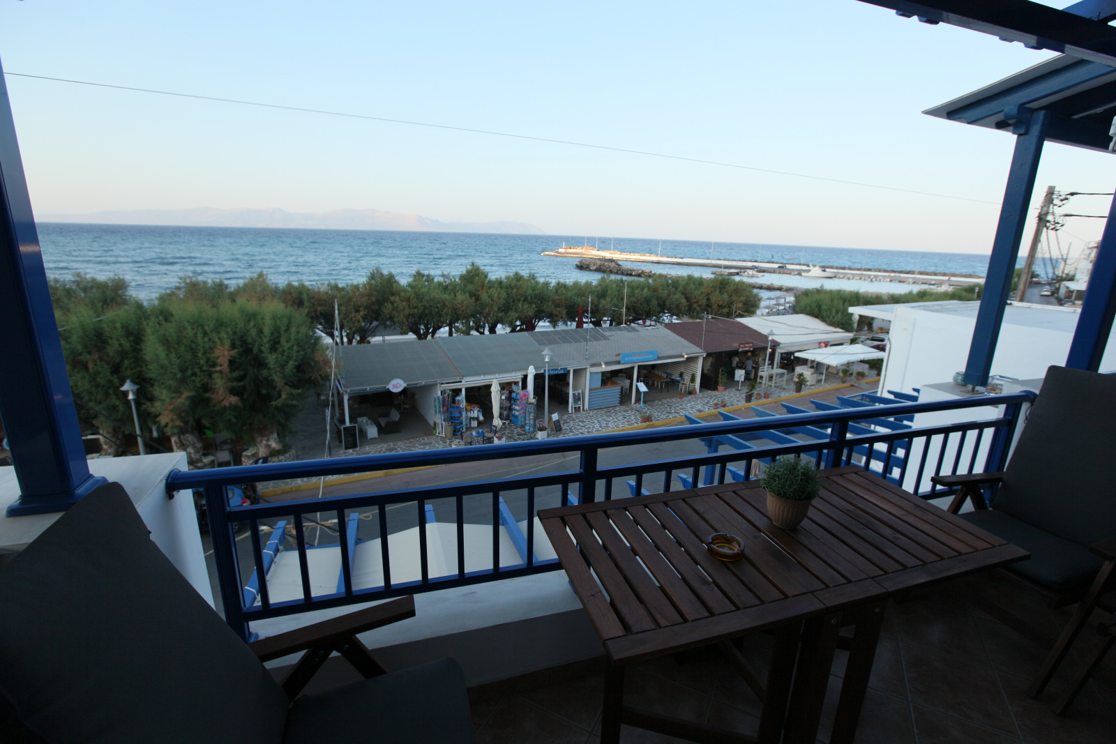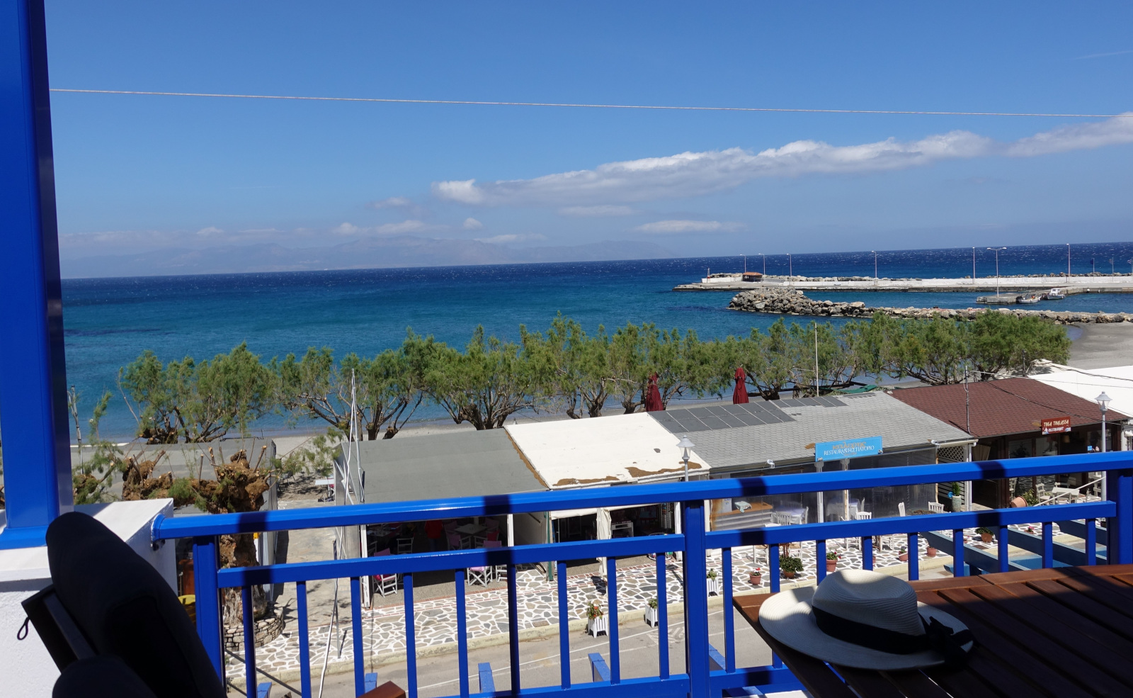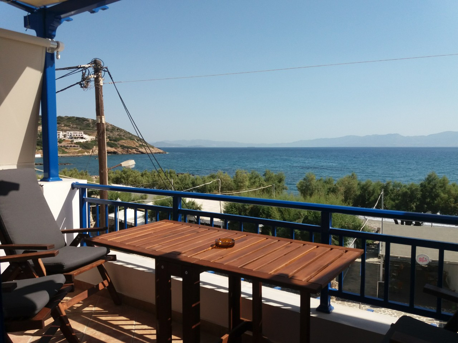 With unobstructed view over the beach and the little harbour you can let your imagination travel you all the way to the opposite land of Peloponnese or play with the names of the Cruise ships floating by