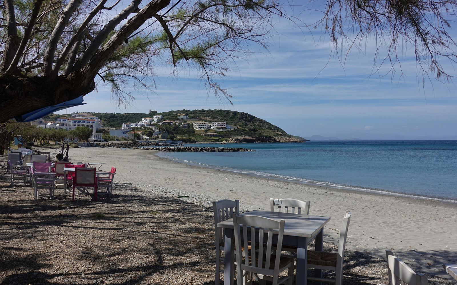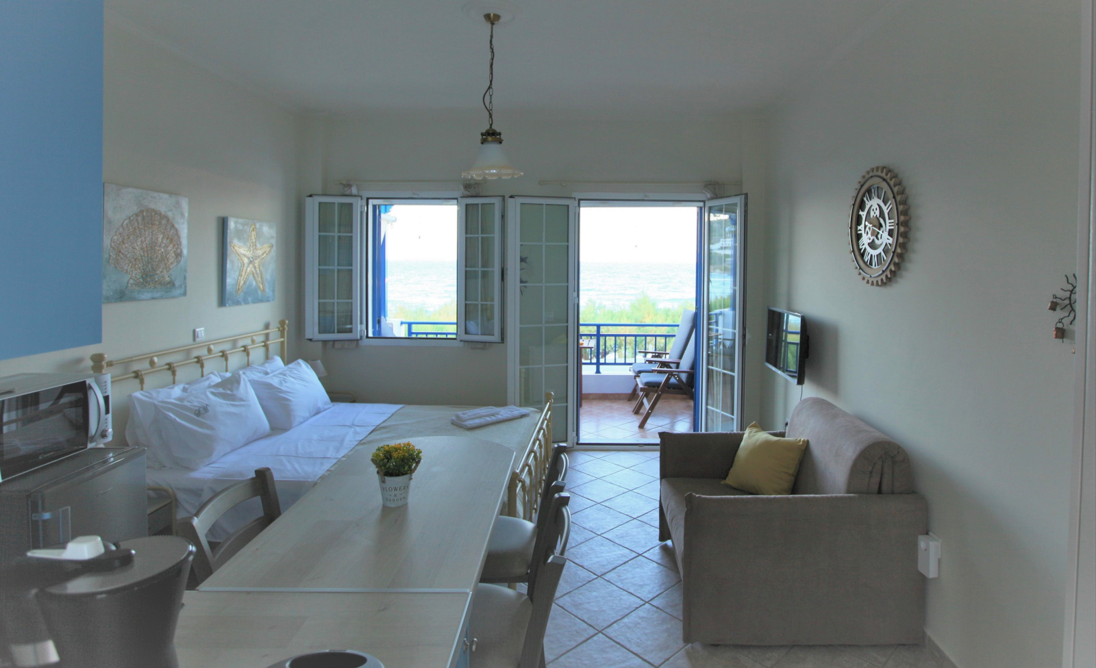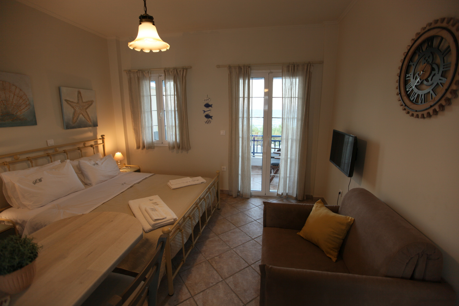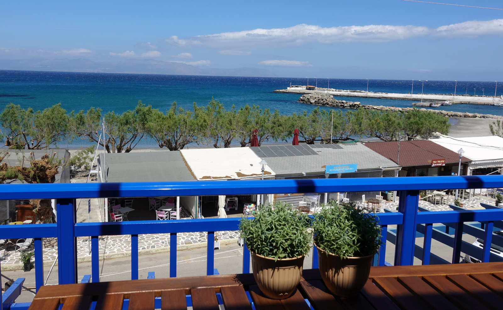 With unobstructed view over the beach and the little harbour you can let your imagination travel you all the way to the opposite land of Peloponnese or play with the names of the Cruise ships floating by