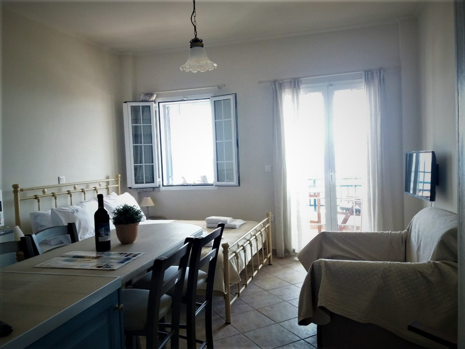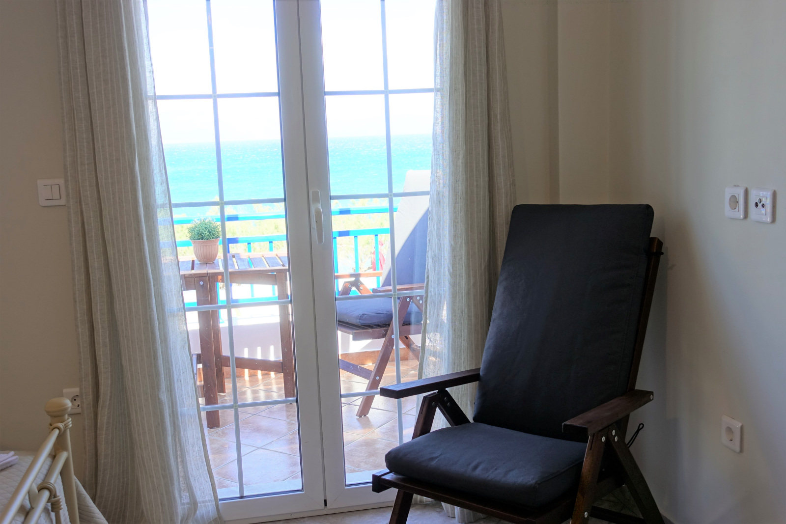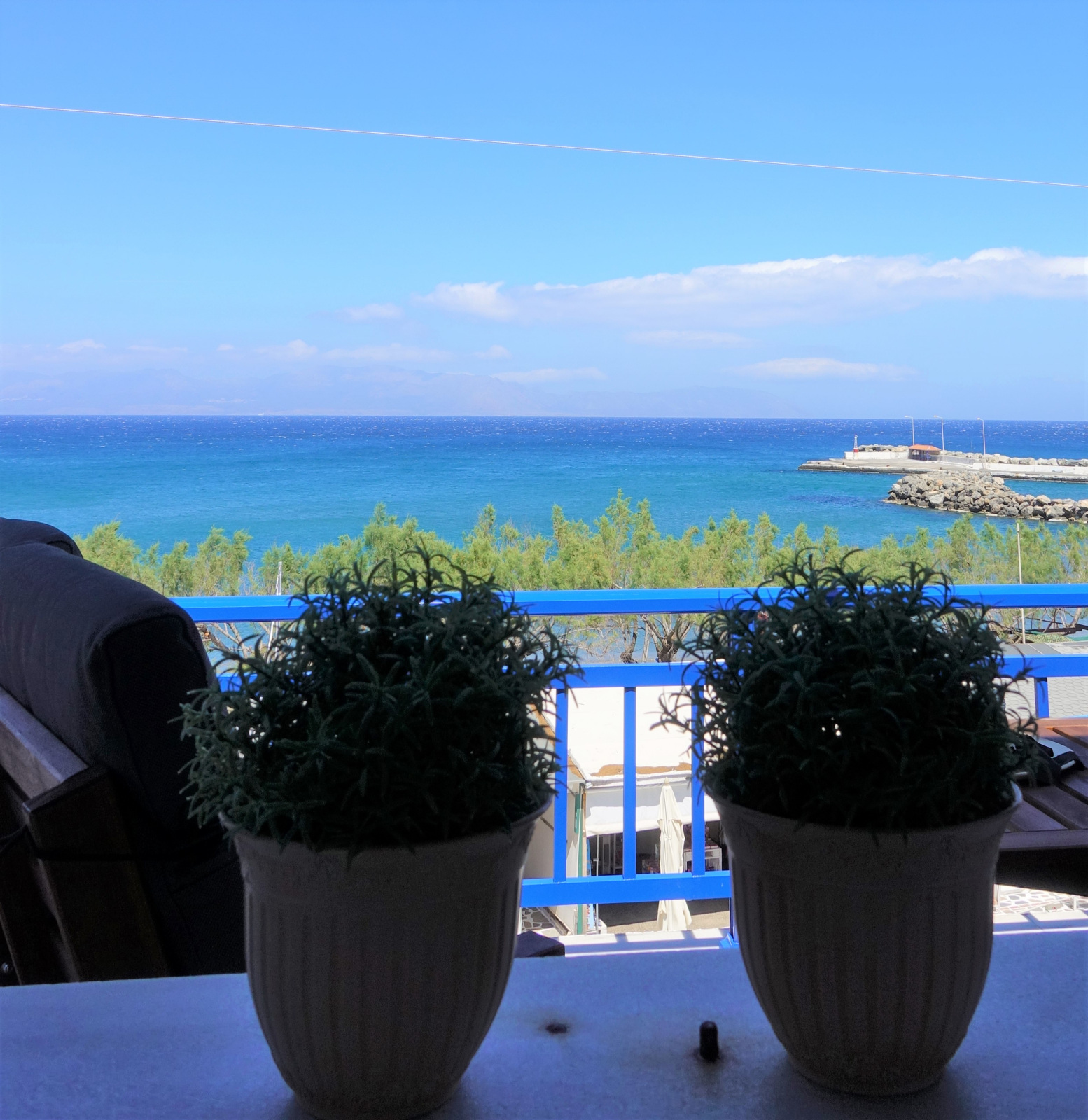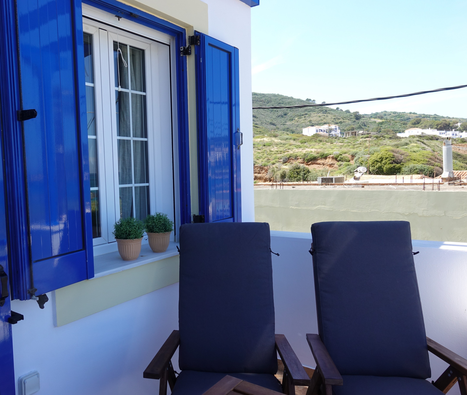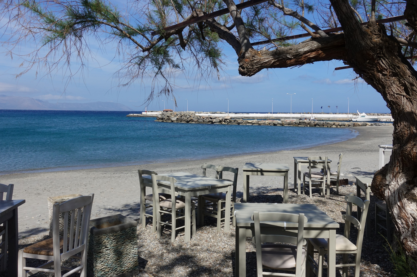 With unobstructed view over the beach and the little harbour you can let your imagination travel you all the way to the opposite land of Peloponnese or play with the names of the Cruise ships floating by
