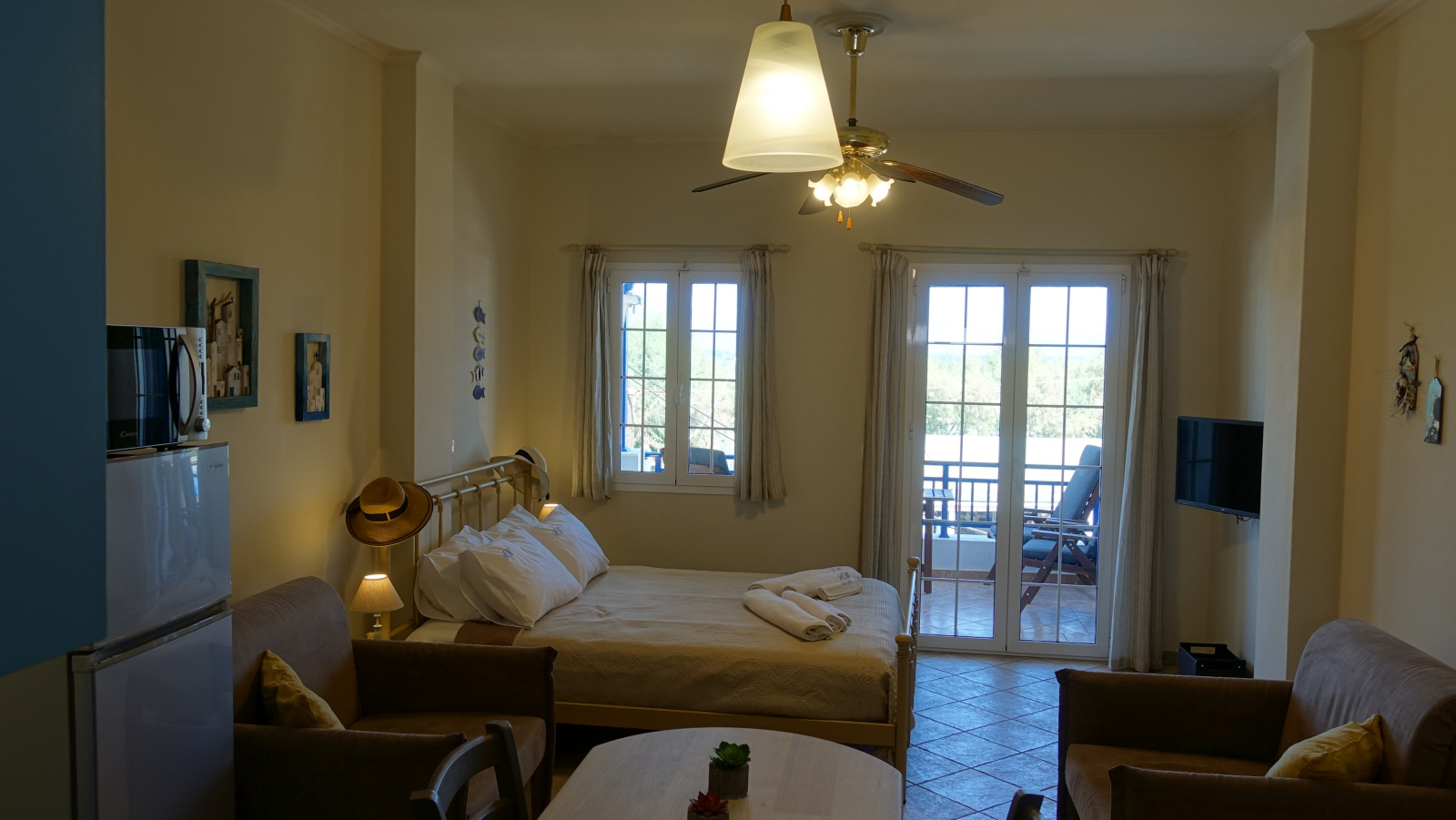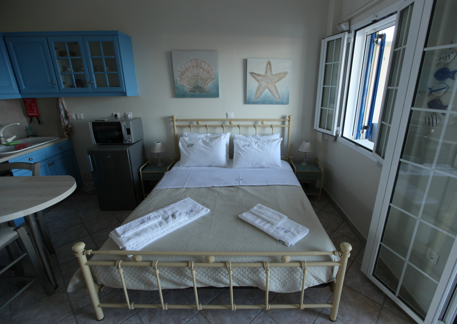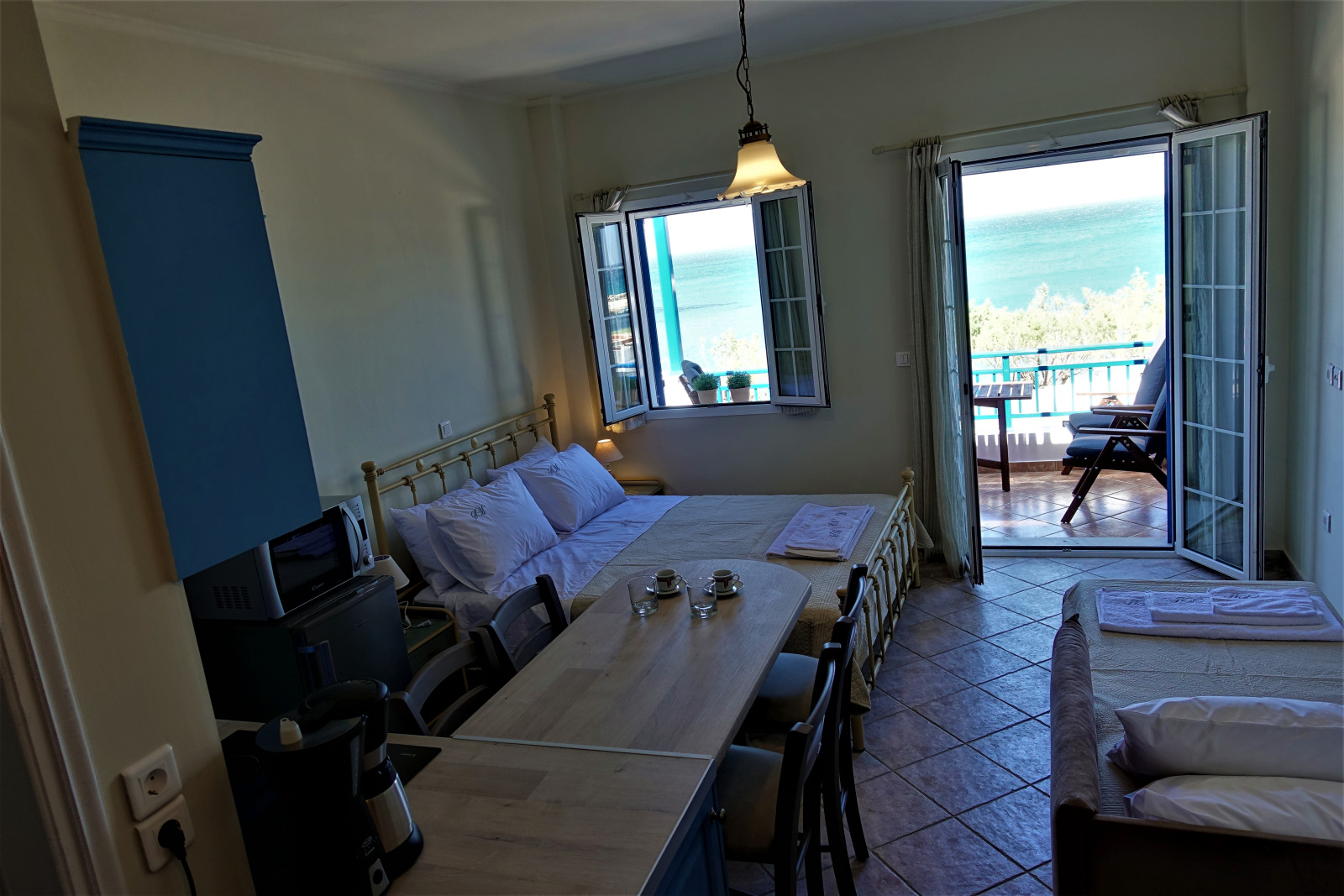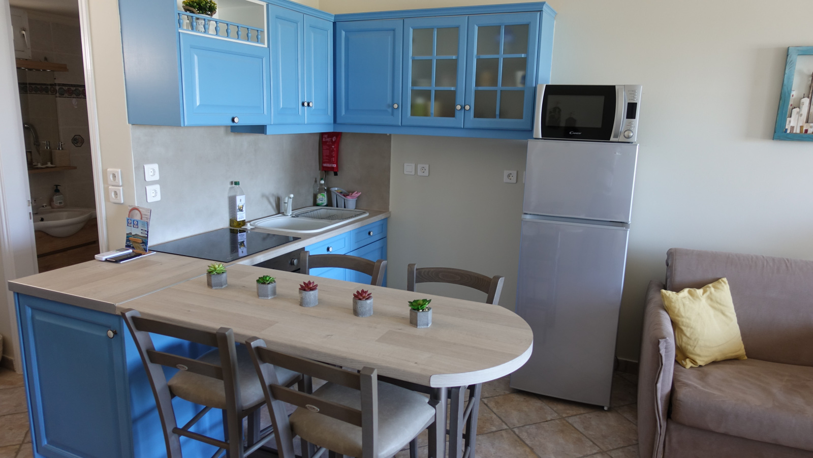 Our apartments, apart from the breath-taking view, offer fully equipped kitchen with 60 cm oven with ceramic cooktop, refrigerator, full size Microwave Oven, coffee maker and toaster, smoke detector, Smart 32’’ TV as well as High Speed Internet connection (up to 50 MBps) over Wi-Fi and Ethernet connections.