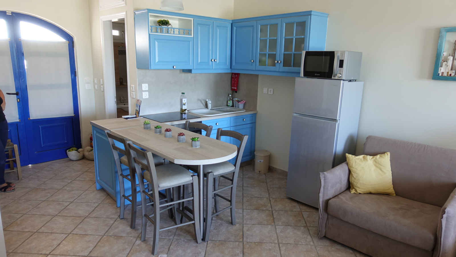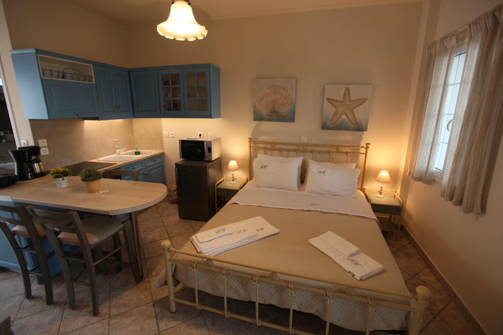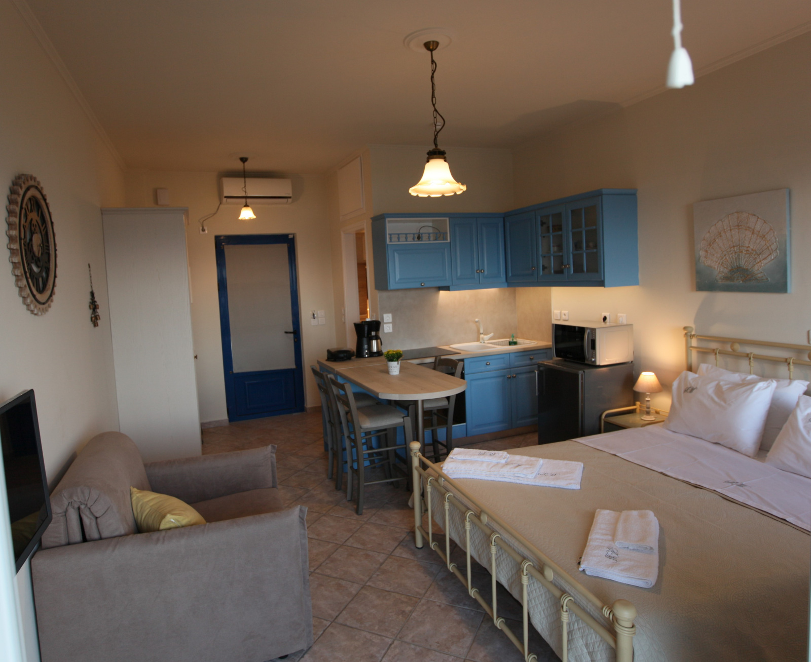 Our apartments, apart from the breath-taking view, offer fully equipped kitchen with 60 cm oven with ceramic cooktop, refrigerator, full size Microwave Oven, coffee maker and toaster, smoke detector, Smart 32’’ TV as well as High Speed Internet connection (up to 50 MBps) over Wi-Fi and Ethernet connections.