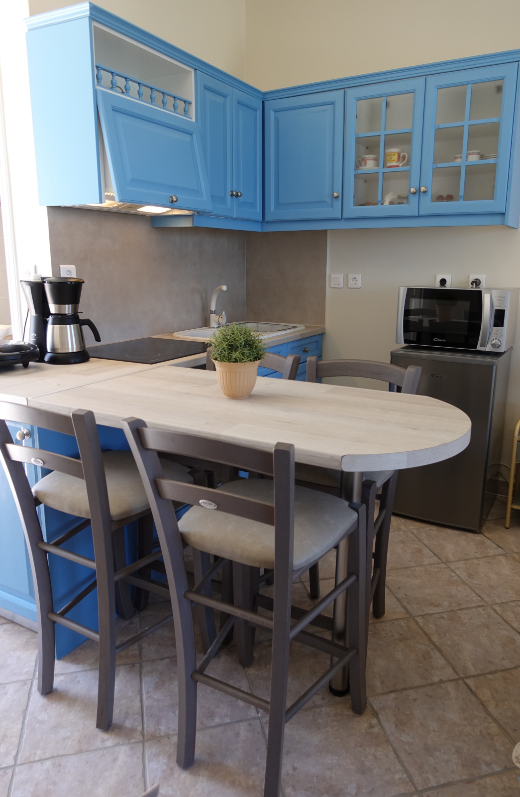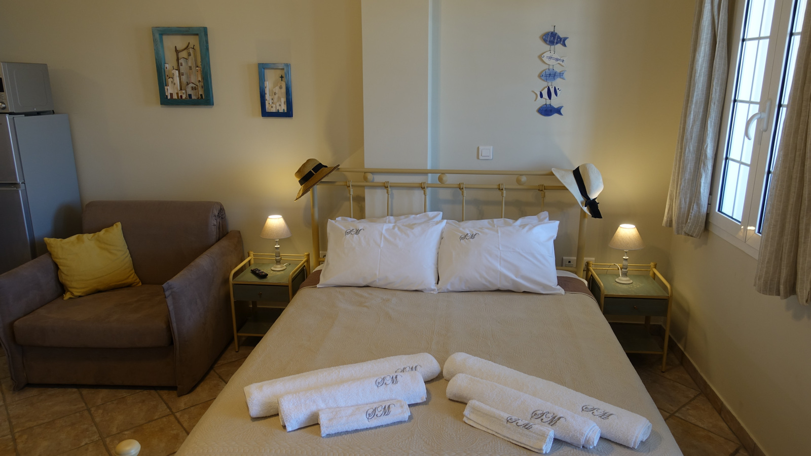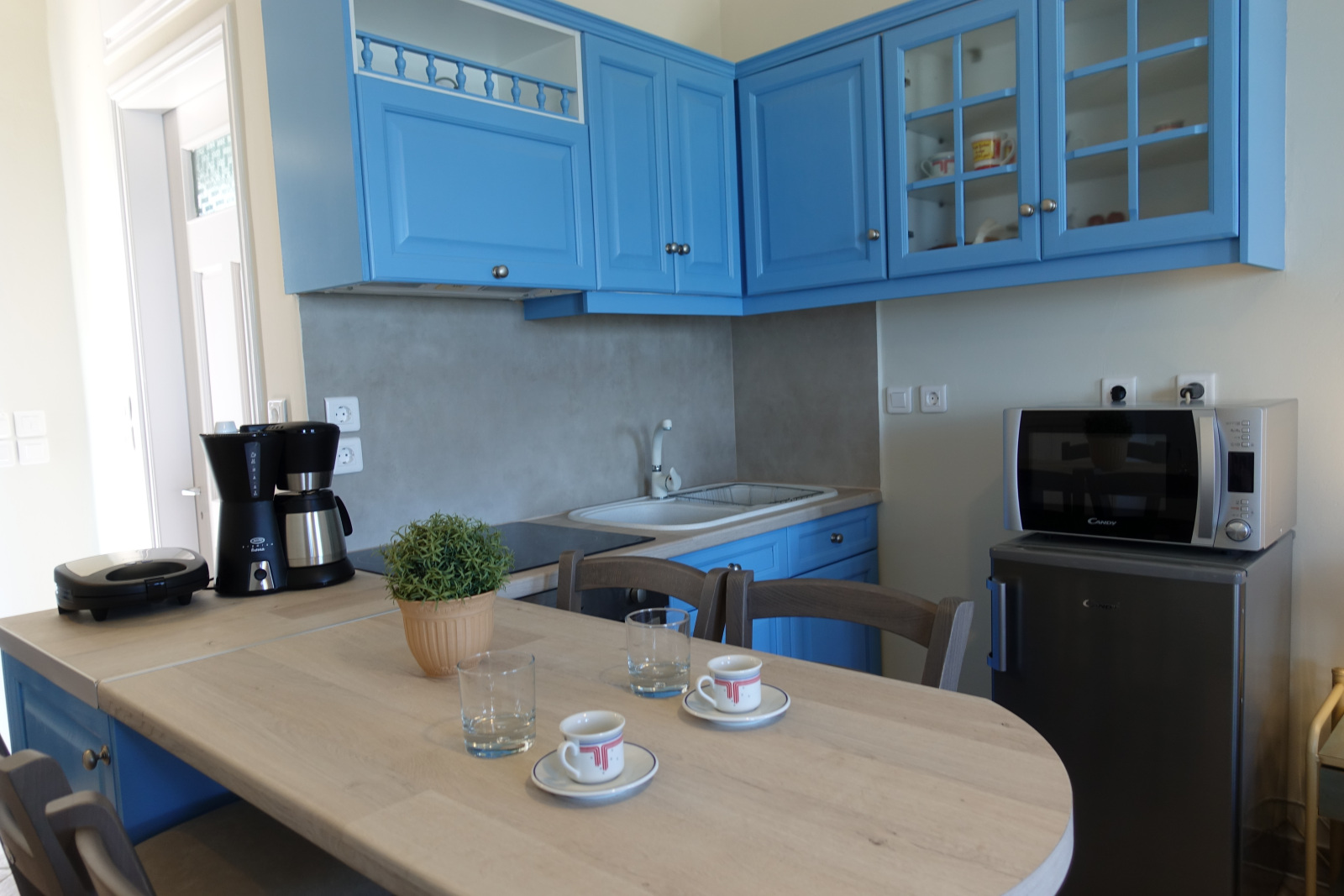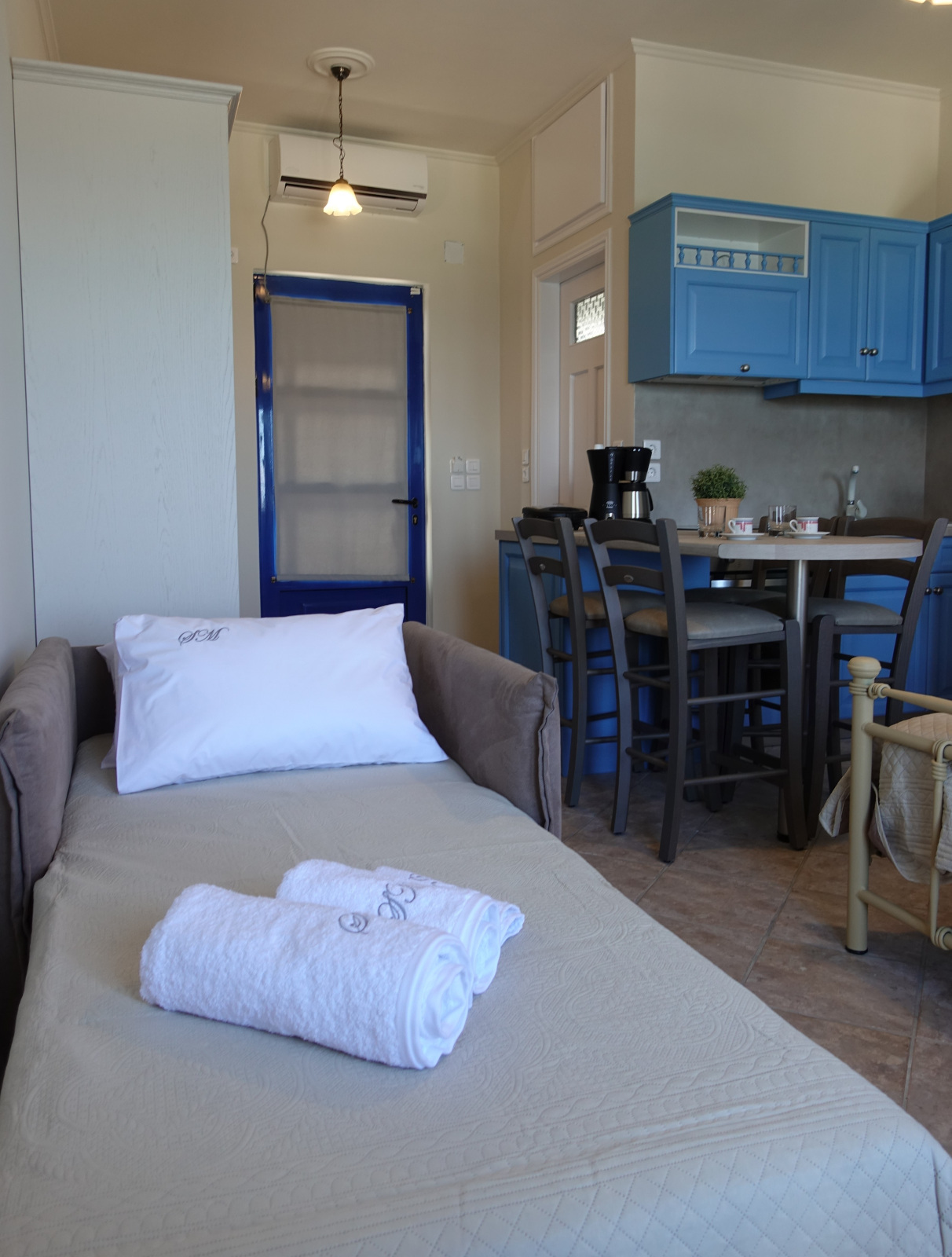 Our apartments, apart from the breath-taking view, offer fully equipped kitchen with 60 cm oven with ceramic cooktop, refrigerator, full size Microwave Oven, coffee maker and toaster, smoke detector, Smart 32’’ TV as well as High Speed Internet connection (up to 50 MBps) over Wi-Fi and Ethernet connections.