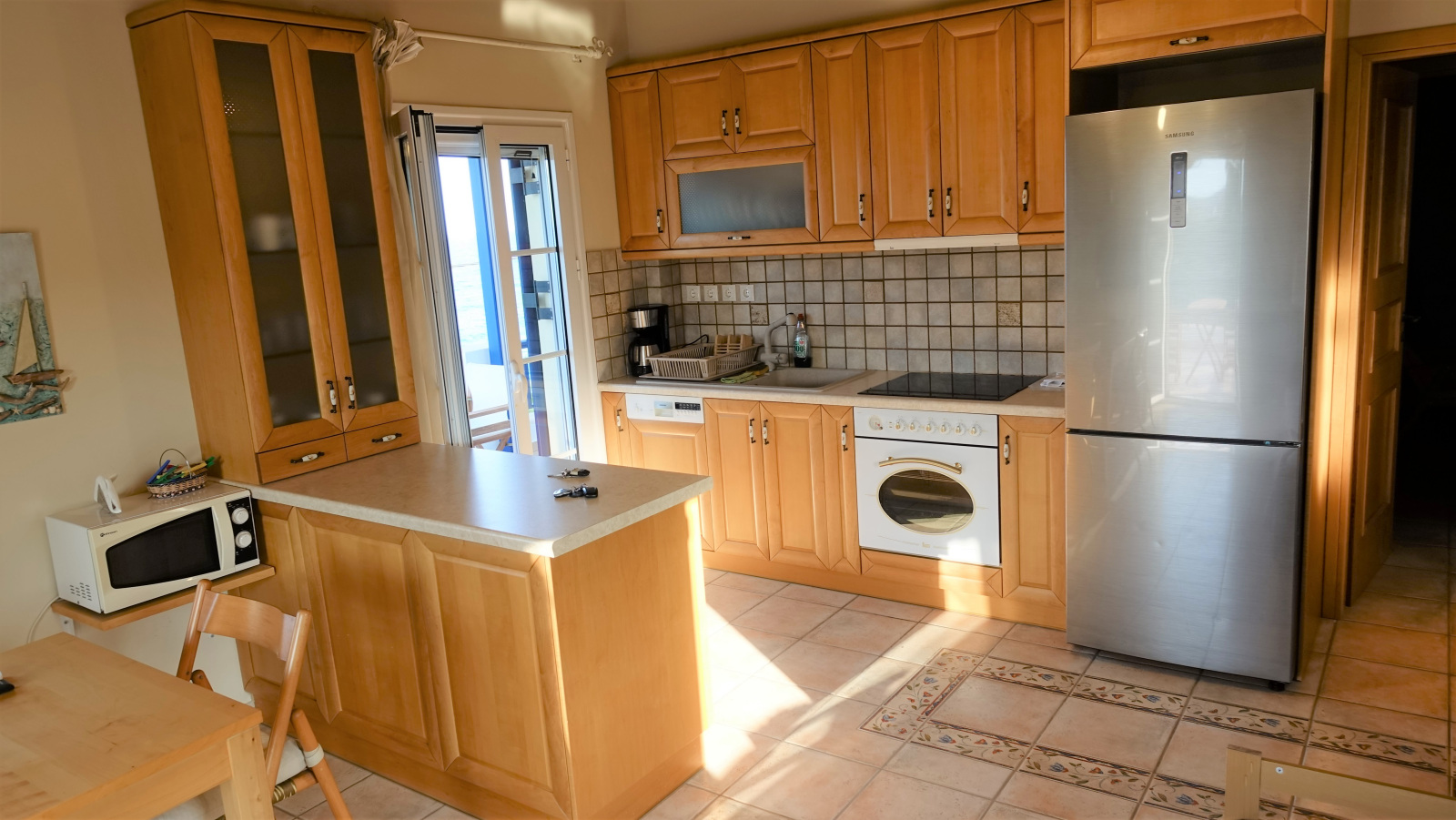 The apartment (58,48 Sq. m.) can accommodate up to 6 persons comprising one bedroom with a double bed (150X200 cm), one with two single beds (90X200) and a living room sofa / bed (100X200 cm) which can, when needed, convert to a full-size double bed (200X200 cm). All rooms are airconditioned, with modern double-glazed windows with mosquito nets as well as central heating for the colder days.