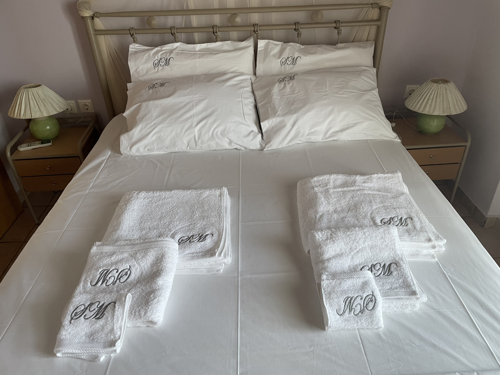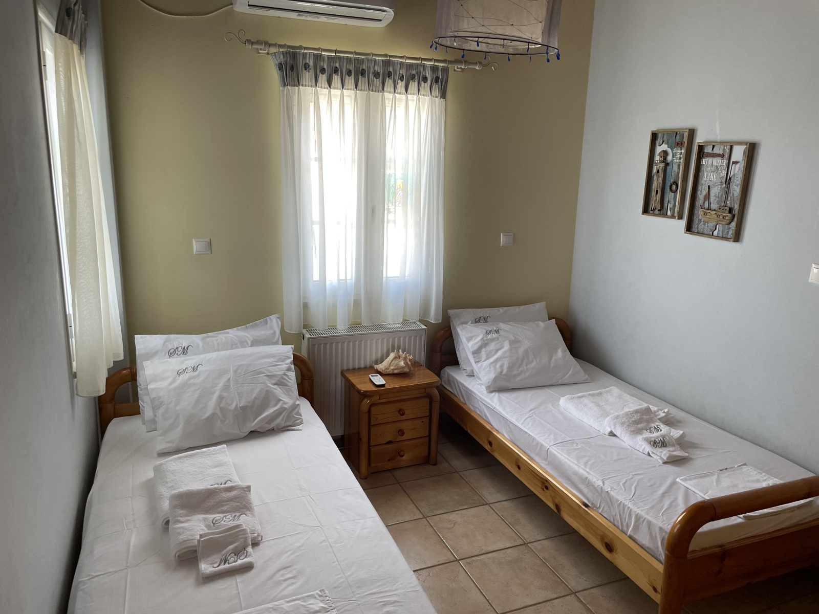 Το Διαμέρισμα μπορεί να φιλοξενήσει μέχρι 6 άτομα, διαθέτοντας δυο κρεβατοκάμαρες (μια με ένα διπλό κρεβάτι (150Χ200 εκ), μια με δύο μονά κρεβάτια και στο καθιστικό ένα καναπέ / κρεβάτι (100Χ200 εκ) που γίνεται και διπλό κρεβάτι (200χ200 εκ) . Όλα τα δωμάτια είναι κλιματιζόμενα , με σύγχρονα κουφώματα, σίτες και διπλά τζάμια. Διαθέτει επίσης κεντρική θέρμανση για το χειμώνα